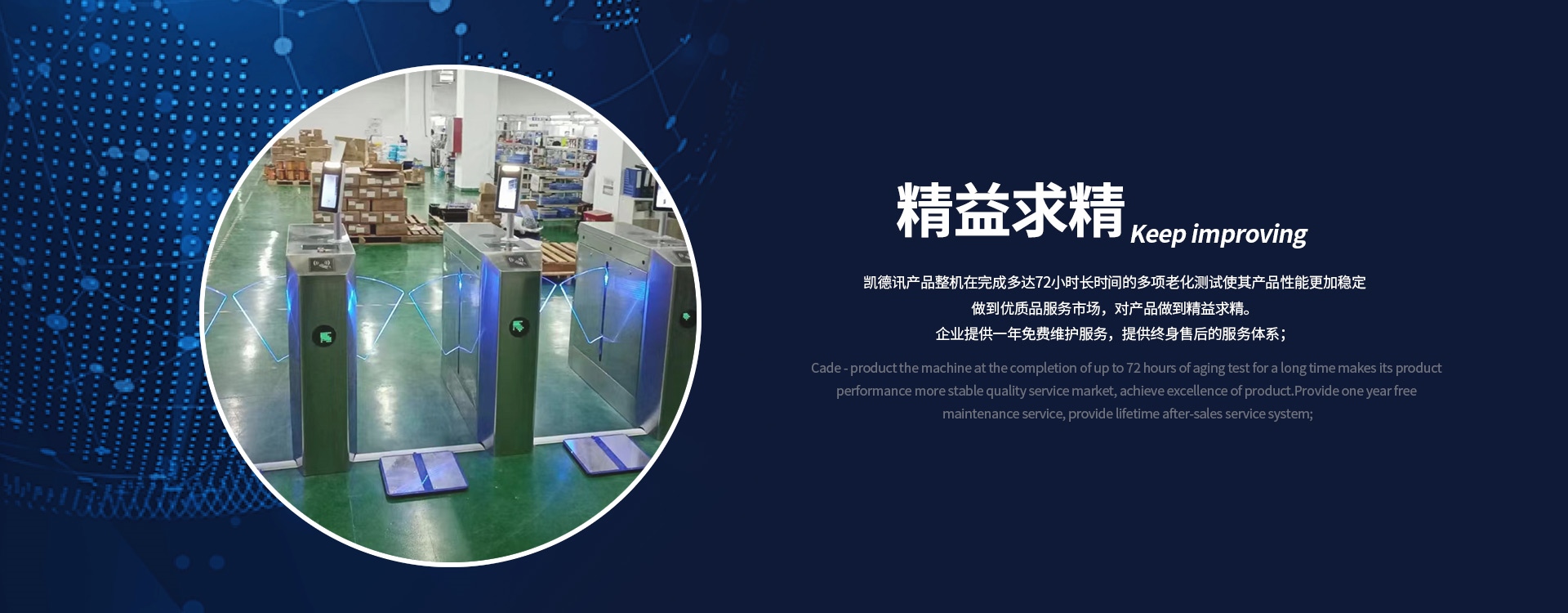 深圳市凱德訊科技有限公司成立于2003年,注冊(cè)資本500萬元,位于港珠澳大灣區(qū)的深圳市,公司集研發(fā)、生產(chǎn)、銷售電子行業(yè)防靜電門禁系統(tǒng)和民用智能通道系統(tǒng)的綜合性企業(yè)。公司擁有自主產(chǎn)權(quán)的產(chǎn)品并一直致力于ESD門禁系統(tǒng)、智能安防門禁系統(tǒng)、景區(qū)通道閘機(jī)、人臉識(shí)別閘機(jī)、消費(fèi)系統(tǒng)、智能翼閘的研發(fā)生產(chǎn)與銷售。凱德訊目前擁有多款功能齊全的系統(tǒng)軟件及多款硬件產(chǎn)品,包含成型加工、機(jī)芯研發(fā)、軟件開發(fā)等技術(shù)均為本公司自主研發(fā)、獨(dú)立完成。14年來,凱德訊一直秉承以用戶需求為核心,穩(wěn)定、實(shí)用、智能的產(chǎn)品是我們開拓市場(chǎng)的基石,務(wù)實(shí)進(jìn)取的精神是我們孜孜不倦的追求,全方位真誠的服務(wù)是我們對(duì)您永恒的承諾。